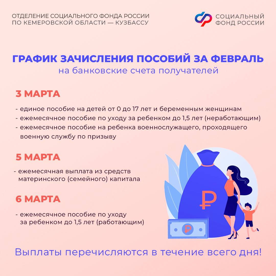 Отделение СФР по Кузбассу напоминает: детские пособия перечисляются за предыдущий месяц (то есть в марте – за февраль), а пенсии и социальные выплаты – за текущий.