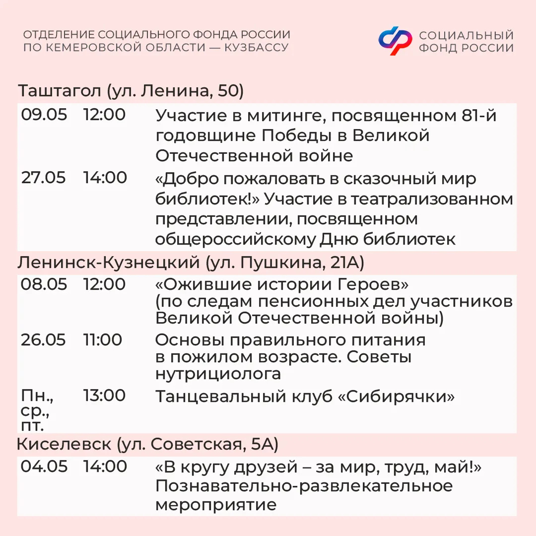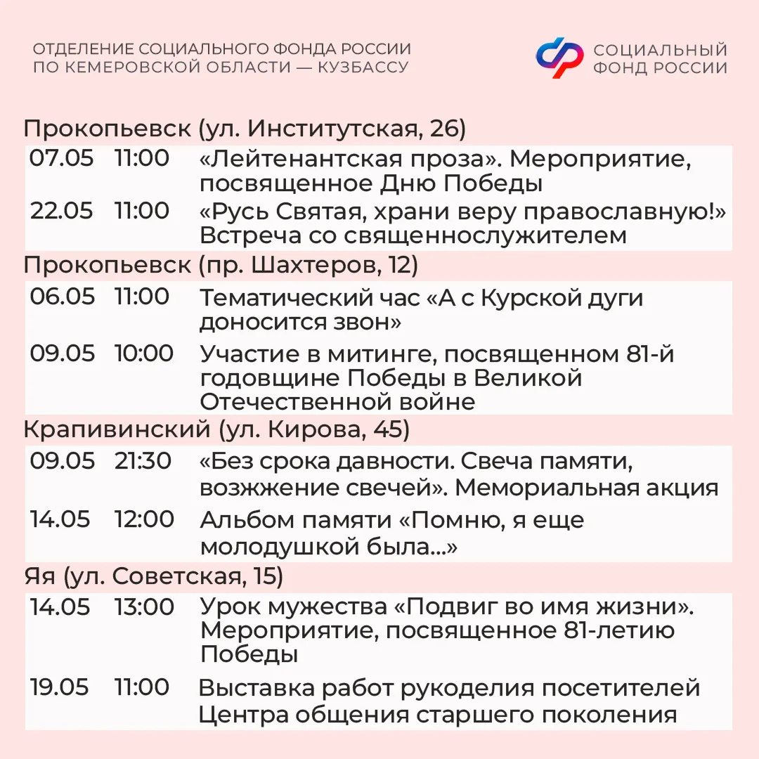Славим Весну, славим Победу! Афиша центров общения старшего поколения Отделения СФР по Кузбассу на май