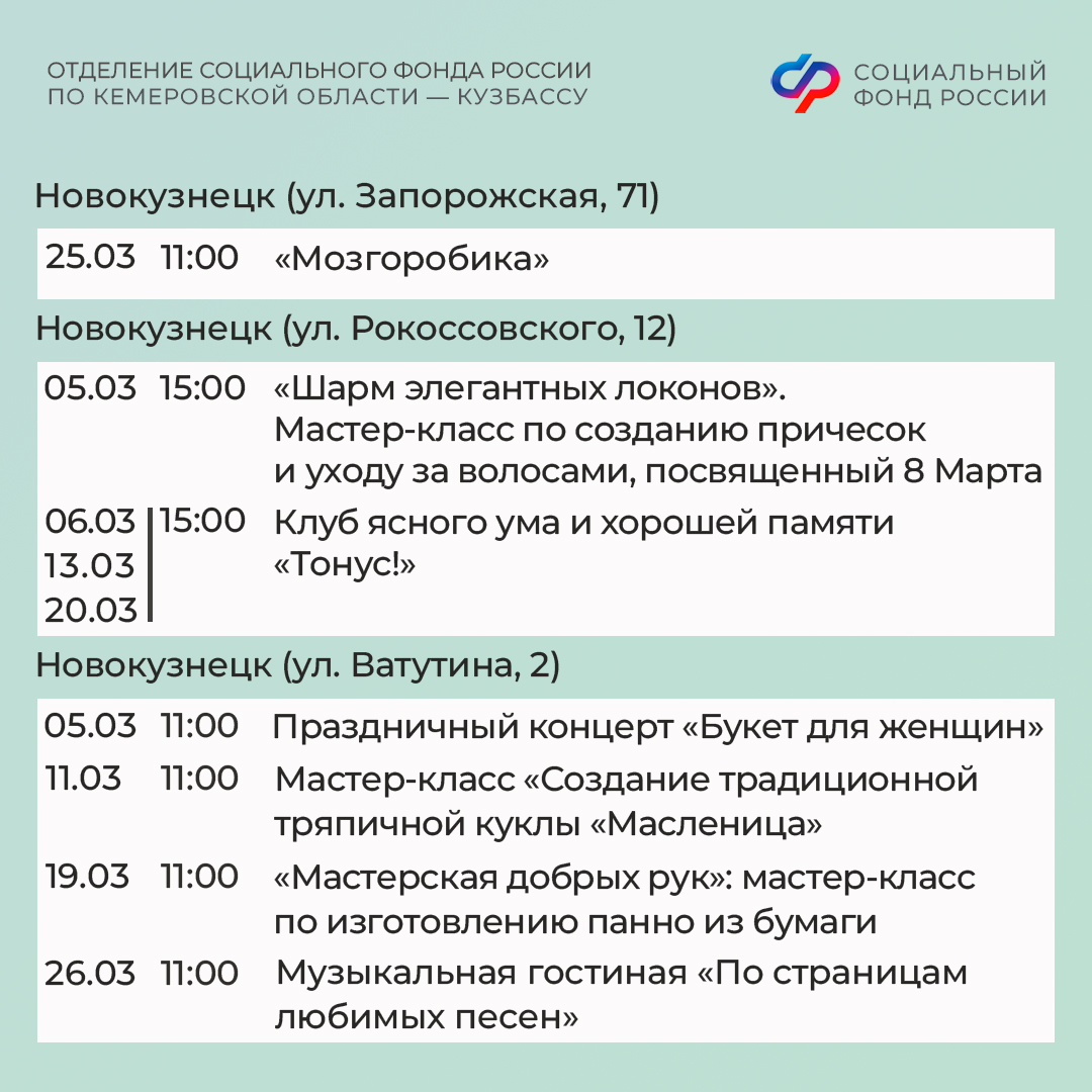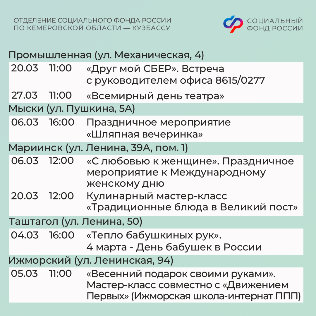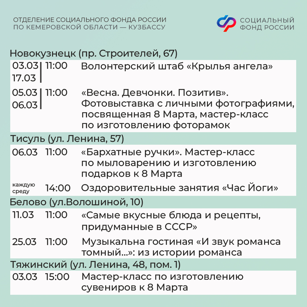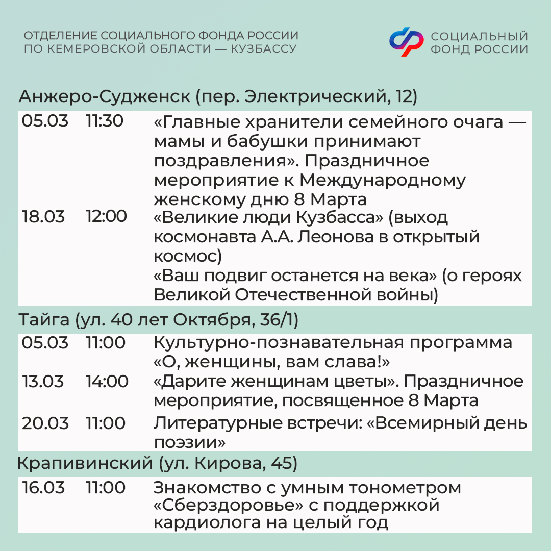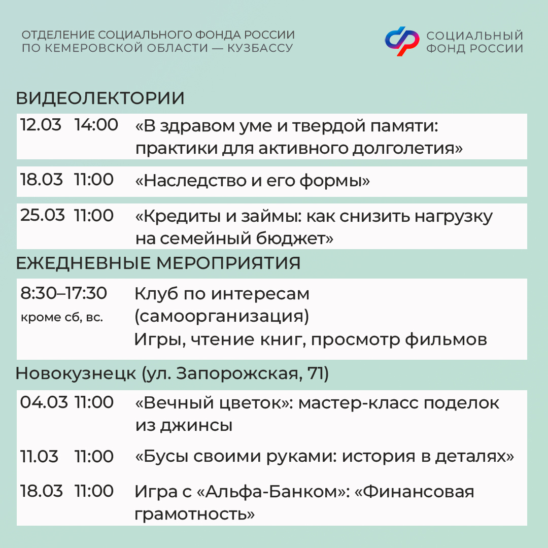 Центры общения старшего поколения Отделения СФР по Кузбассу ждут гостей в марте!