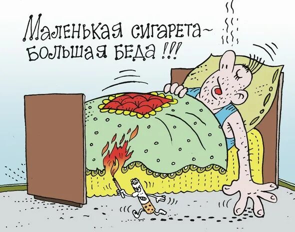 Крайне опасно курить лежа в постели, особенно в нетрезвом состоянии. Курящий засыпает, сигарета падает на постельные принадлежности, отсюда и возгорание. Как правило, в этом случае курильщик получает сильнейшие ожоги или погибает, отравившись ядовитым дымом. И таких случаев немало.