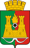 В рассеченном на зеленом (землень) и красном (червлень) поле – две золотые зубчатые двухъярусные башни, соединенные зубчатой стеной того же металла, стоящие на положенном вверх тетивой серебряном луке; между башнями – черный, окаймленный серебром камень (о четырех округлых и четырех острых видимых выступах) с исходящим вверх золотым пламенем. Щит увенчан муниципальной короной установленного образца (муниципальная корона городского округа - золотая башенная о пяти видимых зубцах).