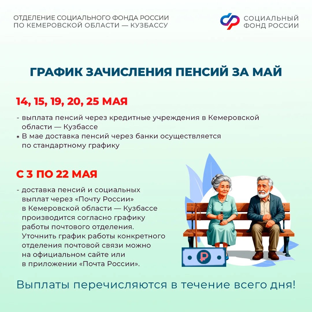 График выплат пенсий в мае у кузбасских получателей не изменится. На банковские счета пенсионеры получат выплаты по стандартному графику – 14, 15, 19, 20 и 25 мая, через «Почту России» выплаты за май так же придут в привычные даты, с 3 по 22 мая.
