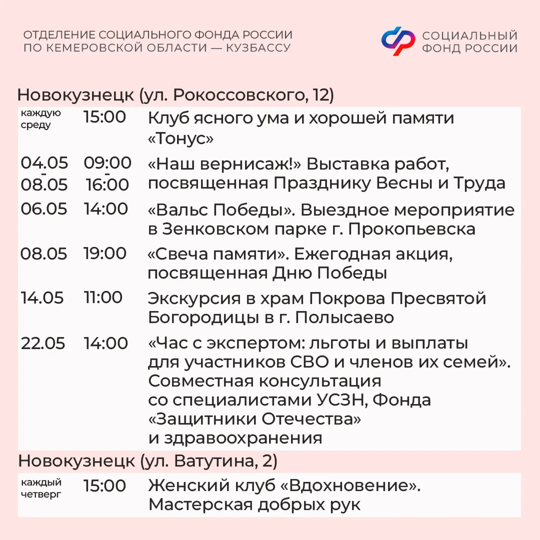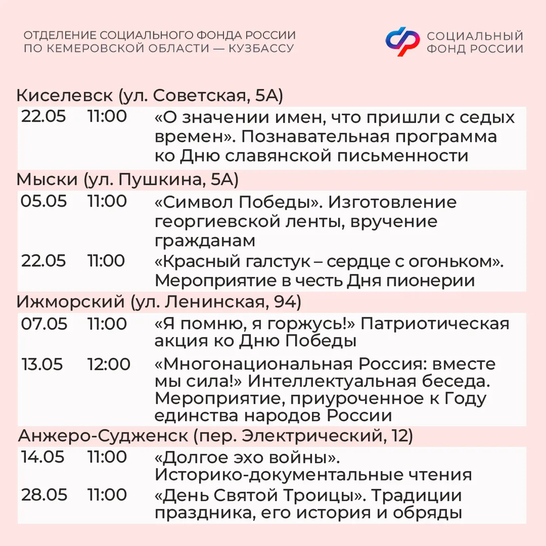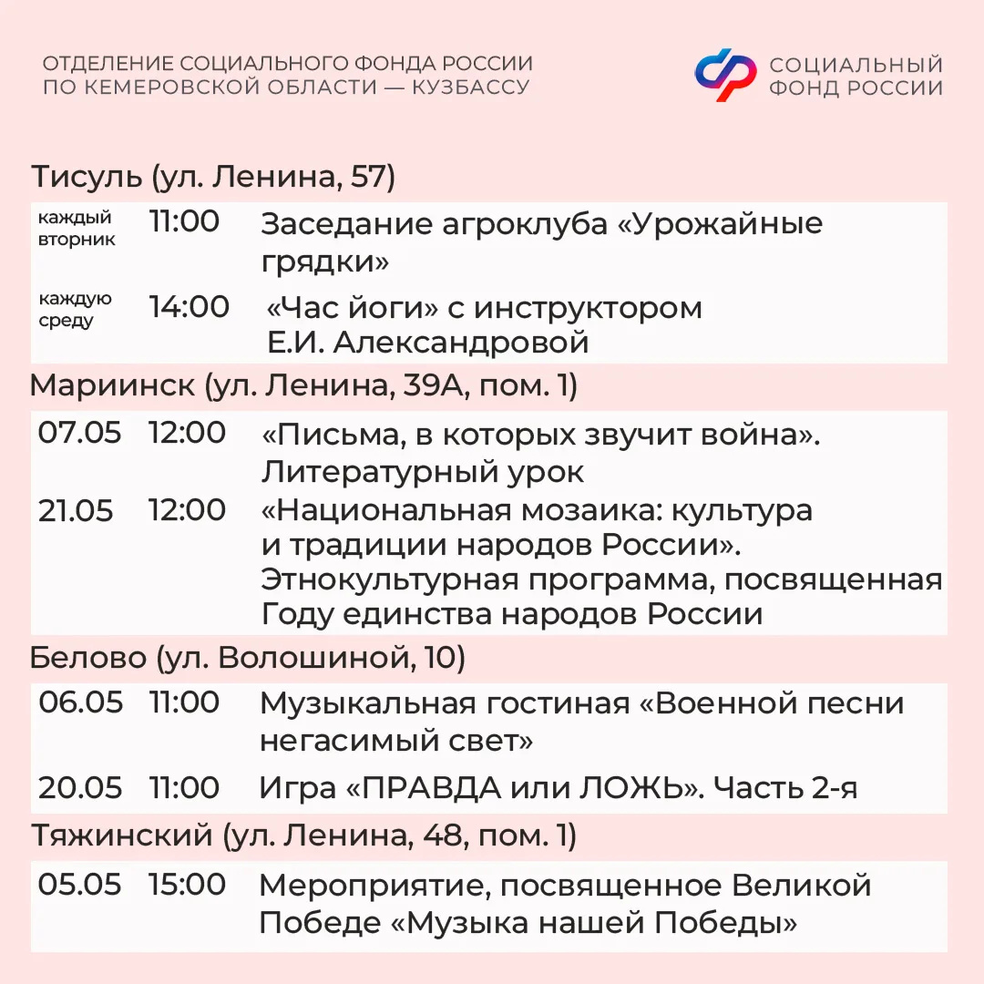 Славим Весну, славим Победу! Афиша центров общения старшего поколения Отделения СФР по Кузбассу на май