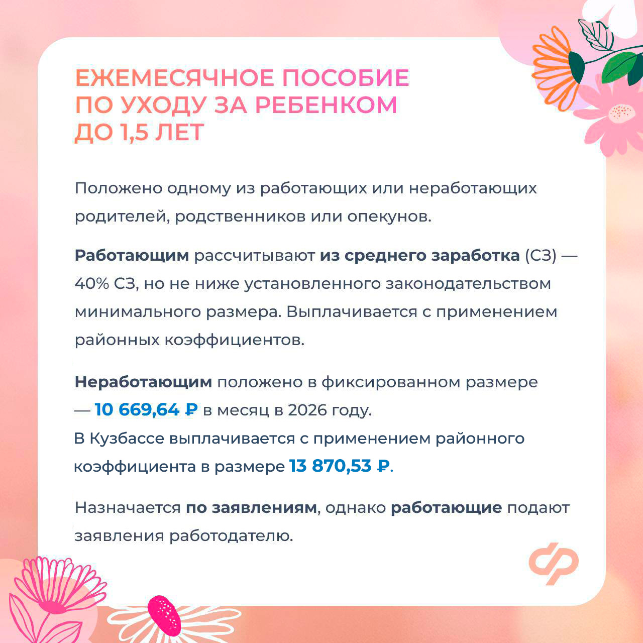 Ежемесячное пособие по уходу за ребенком до 1,5 лет – для работающих составляет 40% среднего заработка, но не ниже минимального размера по законодательству. Неработающим выплачивают в Кузбассе с применением районного коэффициента в размере 13 870,53 руб.